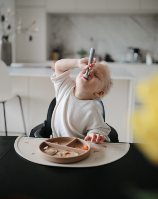 Mushien ensilusikka vaaleanpunaisessa ja hiekan värissä on suunniteltu pieneen käteen. Sen avulla on helppo opetella omatoimista ruokailua. Pin...