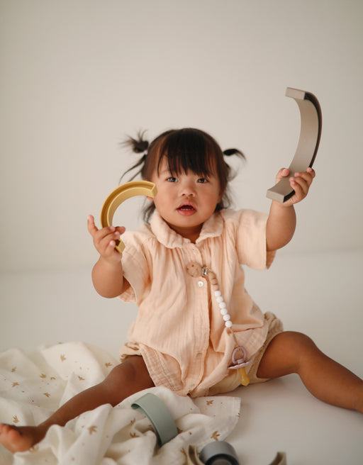 Mushien pinottava sateenkaari lelu. Sateenkaaren osat ovat monipuoliset erilaisiin leikkeihin. Ne kehittävät lapsen kognitiivisia taitoja ja hienom...