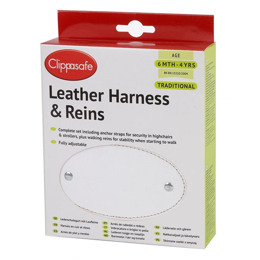 Clippasafen nahkaiset valjaat ja hihna lapsen turvaksi kävellessä tai esimerkiksi syöttötuolissa seisomisen estämiseen. Soveltuu 6kk iästä 4v saakk...