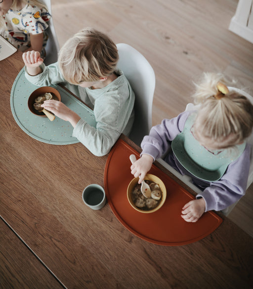 Mushien silikoninen ruokailualusta vihreässä värissä suojaa pöytää lapsen ruokailun aikana. Myös ruokailuvälineet, esimerkiksi lautanen pysyy parem...