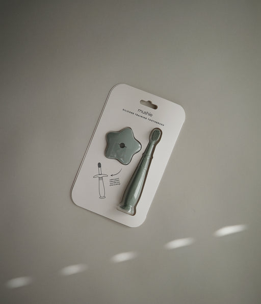 Mushien ensihammasharja vihreässä värissä. Harja on pehmeää silikonia, joten se on mukava lapsen suuhun ja ikenille. Tähti varressa on irrotettava....