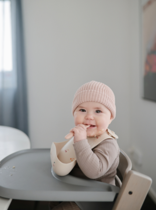 Mushien ensilusikka vaaleanpunaisessa ja hiekan värissä on suunniteltu pieneen käteen. Sen avulla on helppo opetella omatoimista ruokailua. Pin...